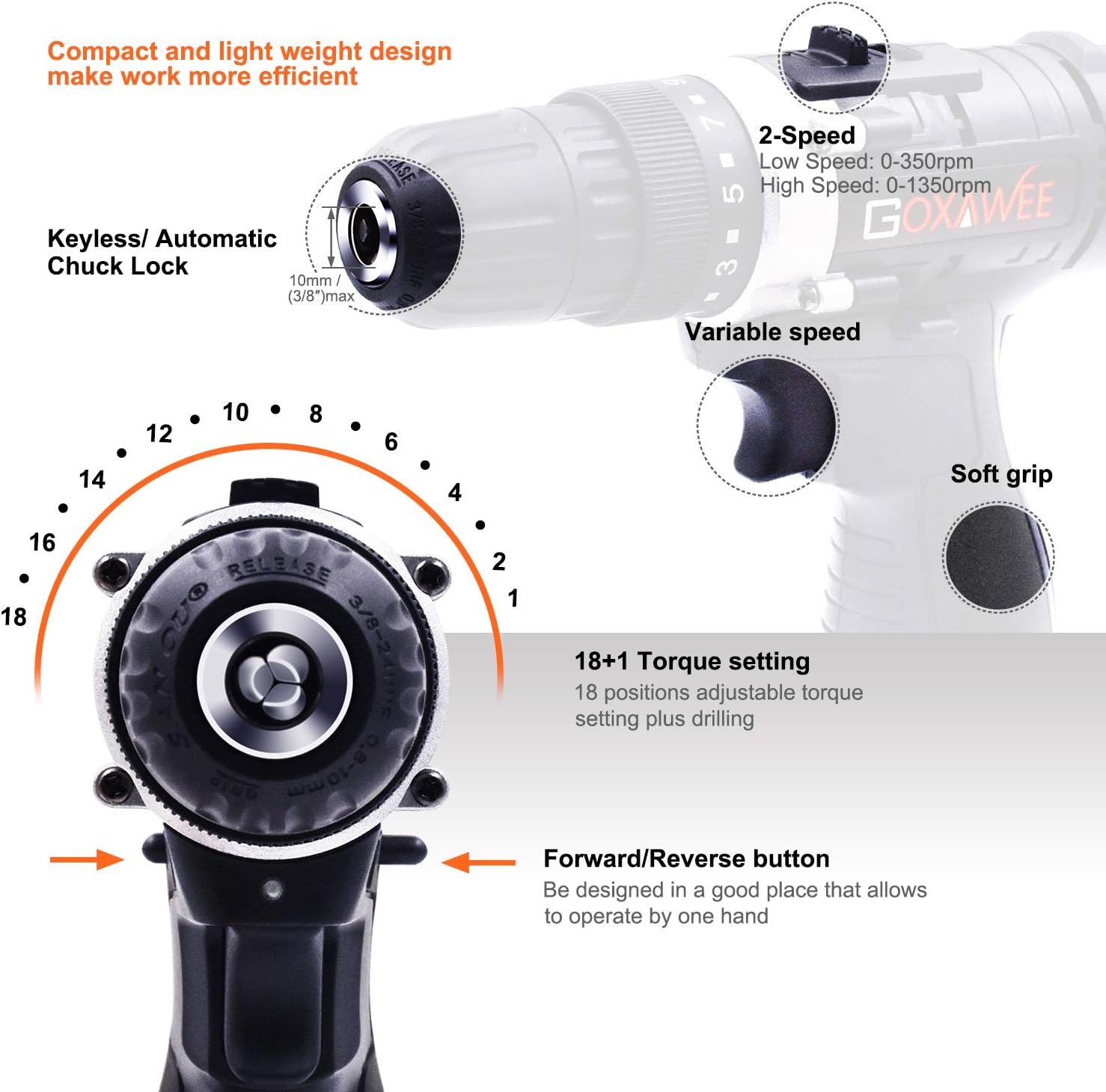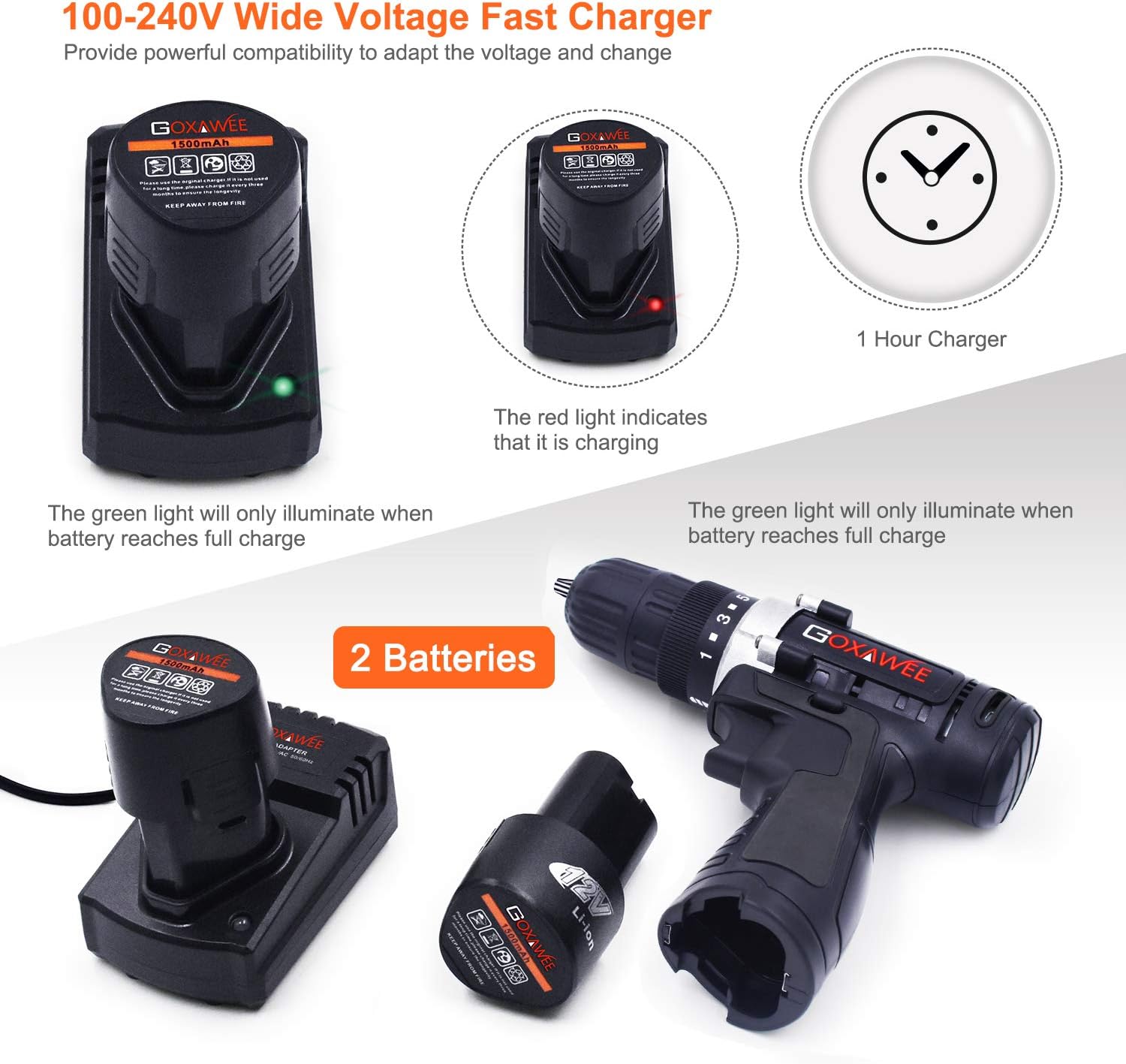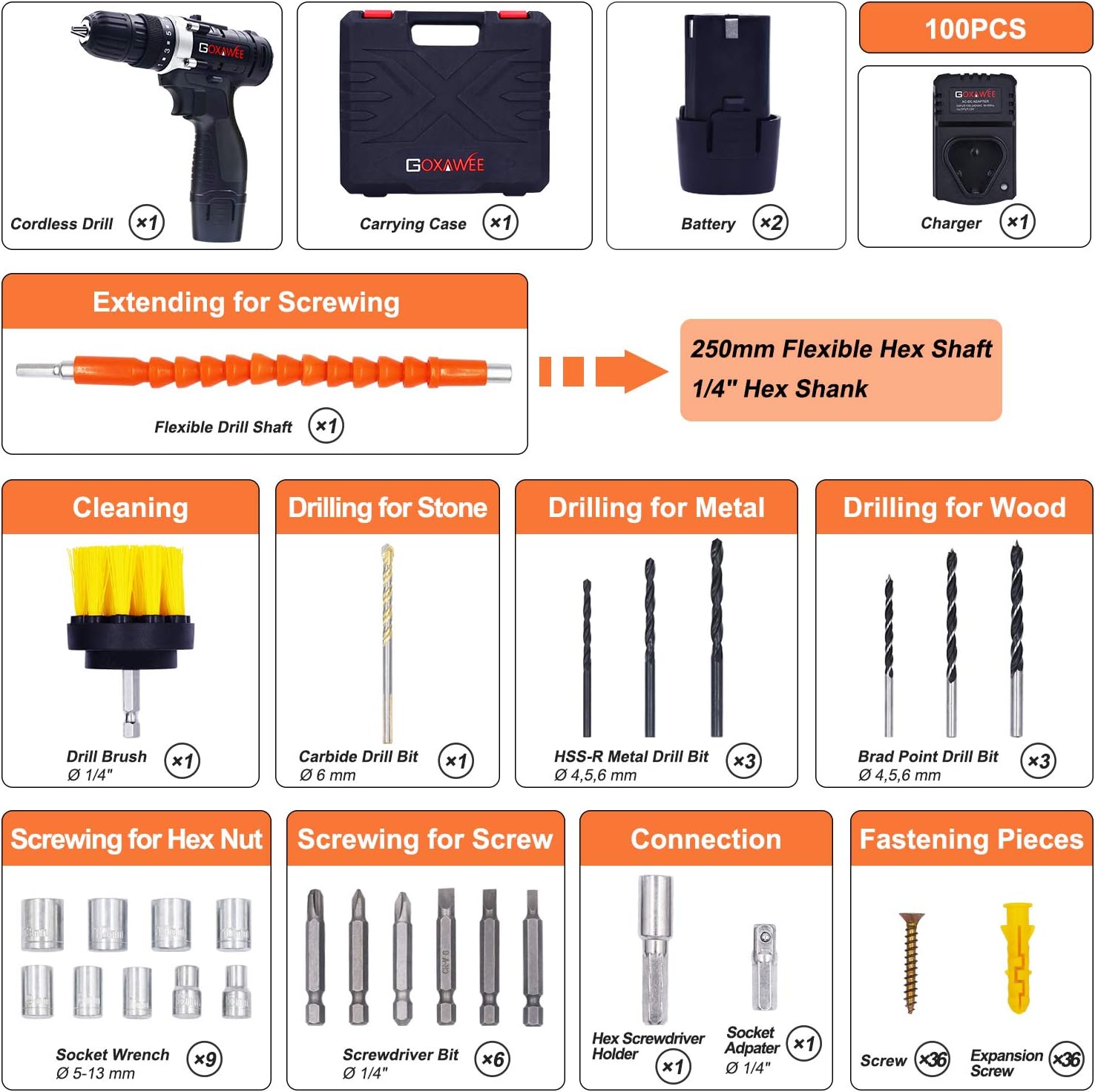 Cordless Drill with 2 Batteries – GOXAWEE Electric Screw Driver Set 100pcs (Max Torque 30Nm, 2-Speed, 10mm Automatic Chuck) for Home Improvement & DIY Project