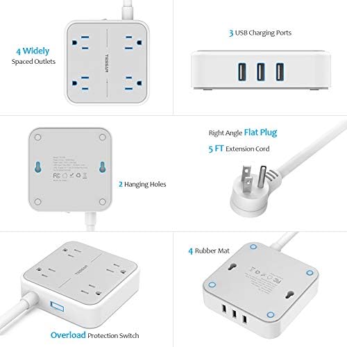 Power Strip with USB Ports, TESSAN Mountable Flat Plug Extension Cord with 4 Widely Spaced Outlets, 3 USB Charger 5 FT Power Cord, Compact Size Charging Station for Travel, Cruise Ship Essentials